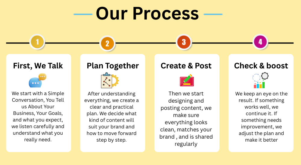 We don’t post content just for the sake of posting. Before doing anything, we understand your brand, your audience, and your goals. Every step is planned with purpose.